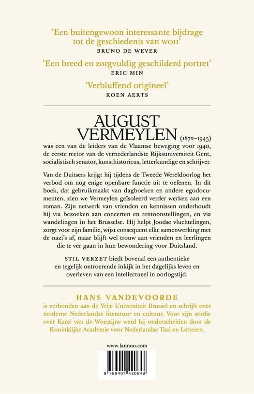 August Vermeylen (1872-1945) was een van de leiders van de Vlaamse beweging voor 1940, de eerste rector van de vernederlandste Rijksuniversiteit Gent, socialistisch senator, kunsthistoricus, letterkundige en schrijver. Van de Duitsers krijgt hij tijdens de Tweede Wereldoorlog het verbod om nog enige openbare functie uit te oefenen. In dit boek, dat gebruikmaakt van dagboeken en andere egodocumenten, zien we Vermeylen geïsoleerd verder werken aan een roman. Zijn netwerk van vrienden en kennissen onderhoudt hij via bezoeken aan concerten en tentoonstellingen, en via wandelingen in het Brusselse. Hij helpt Joodse vluchtelingen, zorgt voor zijn familie, wijst consequent elke samenwerking met de nazi's af, maar blijft wel trouw aan vrienden en leerlingen die te ver gaan in hun bewondering voor Duitsland. Stil verzet biedt bovenal een authentieke en tegelijk ontroerende inkijk in het dagelijks leven en overleven van een intellectueel in oorlogstijd.
