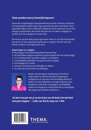 In Stop. krijg je van stopstrateeg Marije van den Berg de vijf heldere stappen waarmee je goed stoppen in jouw team of organisatie wel voor elkaar krijgt. Je krijgt dat extra inzicht om nu toch echt definitief de knoop door te hakken en te stoppen. Mét of zonder feest.