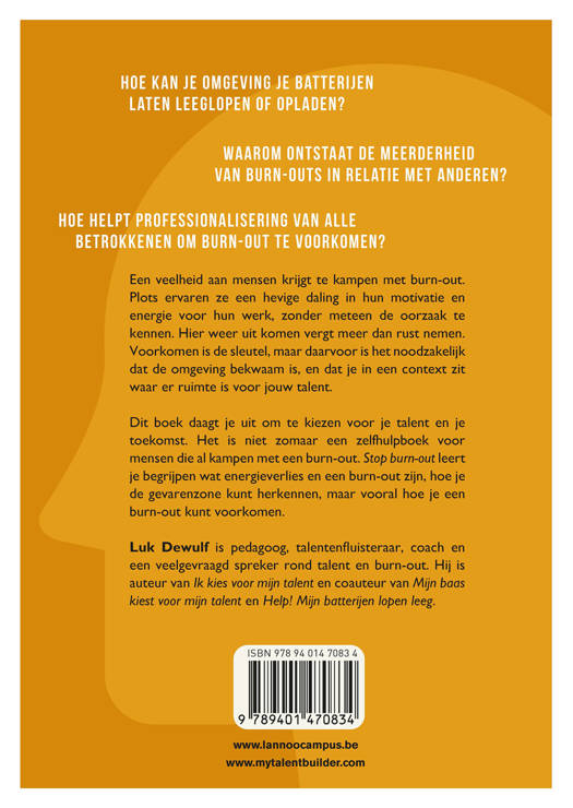 Dit boek daagt je uit om te kiezen voor je talent en je toekomst. Het is niet zomaar een zelfhulpboek voor mensen die al kampen met een burn-out. Stop burn-out leert je begrijpen wat energieverlies en een burn-out zijn, hoe je de gevarenzone kunt herkennen, maar vooral hoe je een burn-out kunt voorkomen.