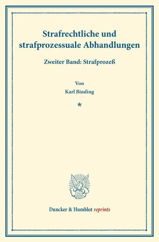 In zwei Bänden legt Karl Binding im Jahr 1915 sein Werk "Strafrechtliche und strafprozessuale Abhandlungen" vor und begründet dies wie folgt: "Das Verbrechen zu lehren samt seiner Rechtslage wird also stets eine große, scharf geschlossene Aufgabe der Rechtswissenschaft bleiben. Gerade dieser Lehre habe ich mein Leben gewidmet, und meine Zuhörer etwas anderes zu lehren, als ich weiß und sie gerade an dieser Stelle lernen sollen, hielte ich für eine Charlanterie und das andere für eine Gewissenlosigkeit ihnen gegenüber."