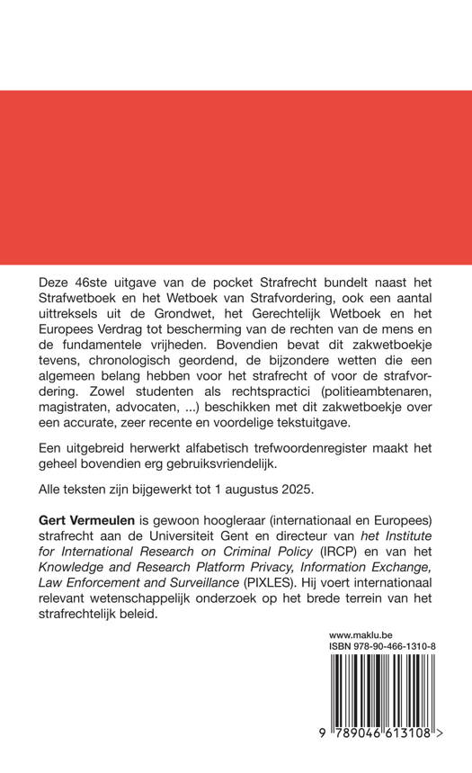 Deze 46ste uitgave van de pocket Strafrecht bundelt naast het Strafwetboek en het Wetboek van Strafvordering, ook een aantal uittreksels uit de Grondwet, het Gerechtelijk Wetboek en het Europees Verdrag tot bescherming van de rechten van de mens en de fundamentele vrijheden. Bovendien bevat dit zakwetboekje tevens, chronologisch geordend, de bijzondere wetten die een algemeen belang hebben voor het strafrecht of voor de strafvordering. Zowel studenten als rechtspractici (politieambtenaren, magistraten, advocaten, ...) beschikken met dit zakwetboekje over een accurate, zeer recente en voordelige tekstuitgave.