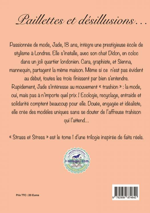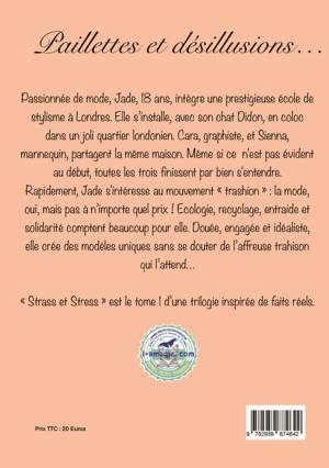 Passionnee de mode, Jade, 18 ans, integre une prestigieuse ecole de stylisme a Londres. Elle s'installe, avec son chat Didon, en coloc avec Cara, graphiste, et Sienna, mannequin. Elles s'entendent plutot bien, meme si toutes les trois critiquent, avec une certaine lucidite, le milieu artistique qu'elles cotoient. Jade, quant a elle, s'interesse de plus en plus au mouvement "trashion" la mode, oui, mais pas a n'importe quel prix. Recyclage et solidarite comptent beaucoup pour elle. Douee, engagee, elle cree et se demene, sans se douter de l'affreuse trahison qui l'attend... "Entre Strass et Stress" est le tome 1 d'une trilogie inspiree de faits reels.