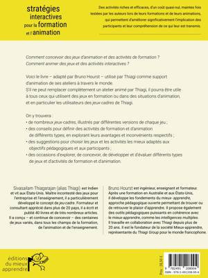 Comment concevoir des jeux d'animation et des activités de formation ? Comment animer des jeux et des activités interactives ? Voici le livre ― adapté par Bruno Hourst ― utilisé par Thiagi comme support d'animation de ses ateliers à travers le monde. S'il ne peut remplacer complètement un atelier animé par Thiagi, il pourra être utile à tous ceux qui utilisent des jeux en formation ou dans des situations d'animation, et en particulier les utilisateurs des jeux-cadres de Thiagi. On y trouvera : de nombreux jeux-cadres, illustrés par différentes versions de chaque jeu ; des conseils pour définir des activités de formation et d'animation de différents types, en explorant leurs avantages et inconvénients respectifs ; des suggestions pour choisir les jeux et les activités les mieux adaptés aux objectifs pédagogiques et aux participants ; des occasions d'explorer, de concevoir, de développer et d'évaluer différents types de jeux et d'activités de formation et d'animation.