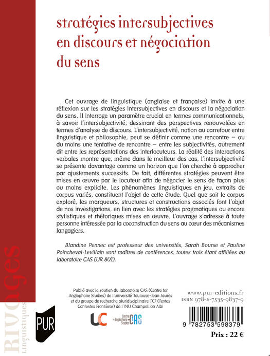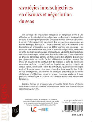 Cet ouvrage de linguistique (anglaise et française) invite à une réflexion sur les stratégies intersubjectives en discours et la négociation du sens. Il interroge un paramètre crucial en termes communicationnels, à savoir l’intersubjectivité, dessinant des perspectives renouvelées en termes d’analyse de discours. L’intersubjectivité, notion au carrefour entre linguistique et philosophie, peut se définir comme une rencontre – ou du moins une tentative de rencontre – entre les subjectivités, autrement dit entre les représentations des interlocuteurs. La réalité des interactions verbales montre que, même dans le meilleur des cas, l’intersubjectivité se présente davantage comme un horizon que l’on cherche à approcher par ajustements successifs. De fait, différentes stratégies peuvent être mises en oeuvre par le locuteur afin de négocier le sens de façon plus ou moins explicite. Les phénomènes linguistiques en jeu, extraits de corpus variés, constituent l’objet de cette étude. Quel que soit le corpus exploré, les marqueurs, structures et constructions associés font l’objet de nos investigations, en lien avec les stratégies pragmatique ou encore stylistiques et rhétoriques mises en oeuvre. L’ouvrage s’adresse à toute personne intéressée par la coconstruction du sens au coeur des mécanismes langagiers.