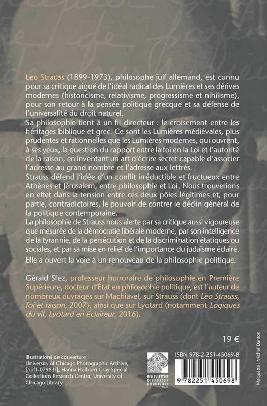 Leo Strauss (1899-1973), philosophe juif allemand, est connu pour sa critique aigue de l'ideal radical des Lumieres et ses derives modernes (historicisme, relativisme, progressisme et nihilisme), pour son retour a la pensee politique grecque et sa defense de l'universalite du droit naturel.Sa philosophie tient a un fil directeur: le croisement entre les heritages biblique et grec. Ce sont les Lumieres medievales, plus prudentes et rationnelles que les Lumieres modernes, qui ouvrent, a ses yeux, la question du rapport entre la foi en la Loi et l'autorite de la raison, en inventant un art d'ecrire secret capable d'associer l'adresse au grand nombre et l'adresse aux lettres. Strauss defend l'idee d'un conflit irreductible et fructueux entre Athenes et Jerusalem, entre philosophie et Loi. Nous trouverions en effet dans la tension entre ces deux poles legitimes et, pour partie, contradictoires, le pouvoir de contrer le declin general de la politique contemporaine. La philosophie de Strauss nous alerte par sa critique aussi vigoureuse que mesuree de la democratie liberale moderne, par son intelligence de la tyrannie, de la persecution et de la discrimination etatiques ou sociales, et par sa mise en relief de l'importance du judaisme eclaire. Elle a ouvert la voie a un renouveau de la philosophie politique.