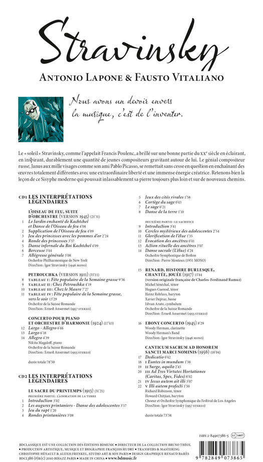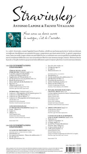 Une biographie de Stravinsky, écrite par François Hudry, illustrée par Antonio Lapone, accompagnée de 2 compact discs.<br /> Le "soleil" Stravinsky, comme l'appelait Francis Poulenc, a brillé sur une bonne partie du XXe siècle en éclairant, en inspirant, durablement une quantité de jeunes compositeurs gravitant autour de lui. Le génial compositeur russe, Janus aux mille visages comme son ami Pablo Picasso, se remettait sans cesse en question en enchaînant des oeuvres totalement différentes avec une extraordinaire liberté et une immense énergie créatrice. Retenons bien la leçon de ce Sisyphe moderne qui poussait inlassablement sa pierre toujours plus loin et sur de nouveaux chemins.<br /><br /> CD 1 Les grands interprètes de Stravinsky<br /><br /> L'Oiseau de feu, suite d'orchestre <br /> 1 Le Jardin enchanté de Kachtcheï <br /> 2 Supplication de l'Oiseau de feu <br /> 3 Jeu des princesses avec les pommes d'or <br /> 4 Ronde des princesses <br /> 5 Danse infernale du Roi Kachtcheï <br /> 6 Berceuse <br /> 7 Allégresse générale <br /> Direction : Igor Stravinsky <br /><br /> Petrouchka <br /> 8 Tableau 1 : Fête populaire de la Semaine grasse <br /> 9 Tableau 2 : Chez Petrouchka <br /> 10 Tableau 3 : Chez le Maure <br /> 11 Tableau 4 : Fête populaire de la Semaine grasse, vers le soir <br /> Ernest Ansermet<br /><br /> Concerto pour piano et orchestre d'harmonie <br /> 12 Largo - Allegro <br /> 13 Largo <br /> 14 Allegro <br /> Nikita Magaloff, piano, Ernest Ansermet <br /><br /> Durée totale 79’18<br /><br /><br /><br /> CD 2 Les grands interprètes de Stravinsky<br /><br /> Le Sacre du printemps <br /> Première partie : L'Adoration de la terre<br /> 1 Introduction <br /> 2 Les augures printaniers - <br /> 3 Jeu du rapt <br /> 4 Rondes printanières <br /> 5 Jeux des cités rivales <br /> 6 Cortège du sage <br /> 7 Le sage <br /> 8 Danse de la terre <br /> Deuxième partie : Le sacrifice<br /> 9 Introduction <br /> 10 Cercles mystérieux des adolescentes <br /> 11 Glorification de l'élue <br /> 12 Evocation des ancêtres <br /> 13 Action rituelle des ancêtres <br /> 14 Danse sacrale (L'élue) <br /><br /> Orchestre Symphonique de Boston<br /> Direction : Pierre Monteux <br /> 15 Renard, histoire burlesque, chantée, jouée <br /> Direction : Ernest Ansermet <br /> 16 Ebony Concerto <br /> Woody Herman, clarinette<br /> Direction : Igor Stravinsky <br /><br /> Canticum Sacrum ad Honorem Sancti Marci Nominis <br /> 17 Dedicatio <br /> 18 I. Euntes in mundum <br /> 19 II. Surge, aquilo <br /> 20 III.Ad Tres Virtutes Hortationes <br /> 21 IV. Jesus autem ait illi <br /> 22 V. Illi autem profecti <br /> Direction : Igor Stravinsky <br /><br /> Durée Totale : 73'58<br /><br />