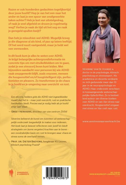 In dit boek kom je alles te weten over ADHD. Je krijgt belangrijke achtergrondinformatie én concrete tips om met struikelblokken om te gaan, zodat je een stressvrij leven kunt leiden. Met bijzondere aandacht voor personen bij wie ADHD vaak onopgemerkt blijft, zoals vrouwen, mensen die hoogsensitief en/of hoogintelligent zijn, perfectionisten en pleasers. Zo transformeer je de chaos in je hoofd en je omgeving naar overzicht en rust.