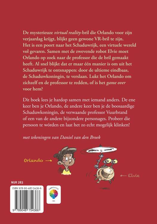 Niets is wat het lijkt in dit gedurfde toneelleesboek op AVI M6-niveau. Als Orlando zijn VR-bril opzet komt hij in het Schaduwrijk terecht. Een mysterieuze plek vol gevaren. Hoe komt Orlando er weer uit? Er zit maar een ding op ... Hij moet de schaduwkoningin verslaan, de ultieme slechterik. Bladzijde voor bladzijde ontdekken kinderen hoe het afloopt met Orlando in dit spannende verhaal uit de serie Toneellezen. Samen lezen ze de dialogen van dit toneelleesboek hardop voor. Met klasgenoten, vrienden of opa’s en oma’s bijvoorbeeld. Kinderen worden zo uitgedaagd om met intonatie te lezen en zich in te leven in de rol die ze spelen.