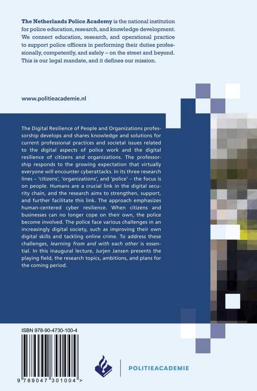 The Digital Resilience of People and Organizations professorship develops and shares knowledge and solutions for current professional practices and societal issues related to the digital aspects of police work and the digital resilience of citizens and organizations. The professorship responds to the growing expectation that virtually everyone will encounter cyberattacks. In its three research lines – ‘citizens’, ‘organizations’, and ‘police’ – the focus is on people. Humans are a crucial link in the digital security chain, and the research aims to strengthen, support, and further facilitate this link. The approach emphasizes human-centered cyber resilience. When citizens and businesses can no longer cope on their own, the police become involved. The police face various challenges in an increasingly digital society, such as improving their own digital skills and tackling online crime. To address these challenges, learning from and with each other is essential. In this inaugural lecture, Jurjen Jansen presents the playing field, the research topics, ambitions, and plans for the coming period.