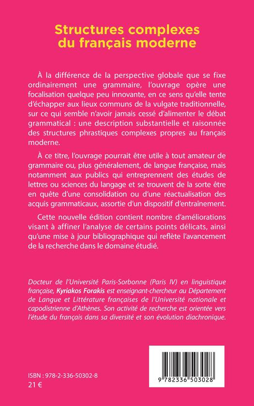 À la différence de la perspective globale que se fixe ordinairement une grammaire, l'ouvrage opère une focalisation quelque peu innovante, en ce sens qu'elle tente d'échapper aux lieux communs de la vulgate traditionnelle, sur ce qui semble n'avoir jamais cessé d'alimenter le débat grammatical: une description substantielle et raisonnée des structures phrastiques complexes propres au français moderne. À ce titre, l'ouvrage pourrait être utile à tout amateur de grammaire ou, plus généralement, de langue française, mais notamment aux publics qui entreprennent des études de lettres ou sciences du langage et se trouvent de la sorte être en quête d'une consolidation ou d'une réactualisation des acquis grammaticaux, assortie d'un dispositif d'entraînement. Cette nouvelle édition contient nombre d'améliorations visant à affiner l'analyse de certains points délicats, ainsi qu'une mise à jour bibliographique qui reflète l'avancement de la recherche dans le domaine étudié.