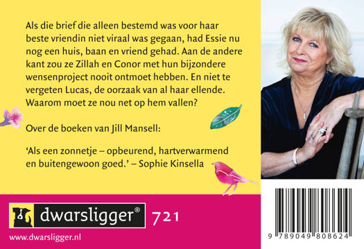 Waarom moest Essie ook zo nodig haar ware gevoelens in die brief zetten? Hij was alleen voor haar beste vriendin bestemd, en niet voor het hele internet. Dan had ze nu nog gewoon een huis, een baan en een vriend gehad. Aan de andere kant, als ze niet opeens alles was kwijtgeraakt, zou ze Zillah en Conor met hun bijzondere wensenproject nooit ontmoet hebben – en niet te vergeten Lucas, de oorzaak van al haar ellende. Waarom moet ze nou net op hem vallen?