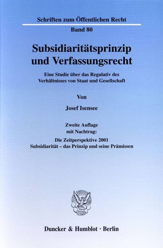 Das Subsidiaritätsprinzip fand Eingang in das Maastrichter Vertragswerk und wurde sanktioniert als Regulativ der Kompetenzausübung. In seiner europarechtlichen Gestalt strahlt es zurück auf das deutsche Verfassungsrecht. Das Grundgesetz erkennt es in seiner neuen Struktursicherungsklausel ausdrücklich an als eine der Vorgaben für die nationale Integrationspolitik, die nach deutschen Verfassungsmustern erfolgen soll. Zu dem Bild, welches das Grundgesetz von sich selbst zeichnet, gehört der Grundsatz der Subsidiarität.Heute, da die Schrift über das Subsidiaritätsprinzip in zweiter Auflage herauskommt, steht das Thema erneut auf der Tagesordnung der Jurisprudenz. Die alten Fragen nach Inhalt und Sinn, Geltungsweise und Judiziabilität erheben sich wieder, nunmehr freilich nicht nur im Kontext des nationalen, sondern auch des supranationalen Rechts. Bekannte Kontroversen über Aussagefähigkeit, Anwendbarkeit, Direktivkraft flammen wieder auf. Doch die Bedingungen, unter denen die Kontroversen auszutragen sind, haben sich verändert, seit das Subsidiaritätsprinzip Rückhalt im geschriebenen Recht gefunden hat. Das Wort der europäischen Verträge und das Wort des Grundgesetzes streiten für die Wirksamkeit des Prinzips.Die Monographie aus dem Jahre 1968 wird unverändert wieder vorgelegt, aber ergänzt um eine Betrachtung in der Sicht des Jahres 2001: über die Prämissen des Subsidiaritätsprinzips, die Bedingungen seiner Anwendbarkeit und über seine Erscheinungsformen im geltenden Recht.