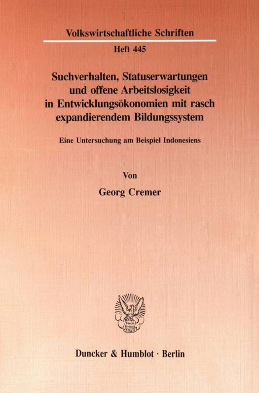 Die vorliegende Untersuchung leistet am Beispiel Indonesiens einen Beitrag zur Erklärung offener Arbeitslosigkeit in Entwicklungsökonomien und diskutiert Ansatzpunkte für wirtschaftspolitische Maßnahmen zur Reduzierung offener Arbeitslosigkeit. Der Arbeitsmarkt Indonesiens hat jährlich etwa zwei Millionen Neuzugänger zu verkraften. Der Autor war mehrere Jahre als Leiter eines Entwicklungsprojektes in Indonesien tätig.