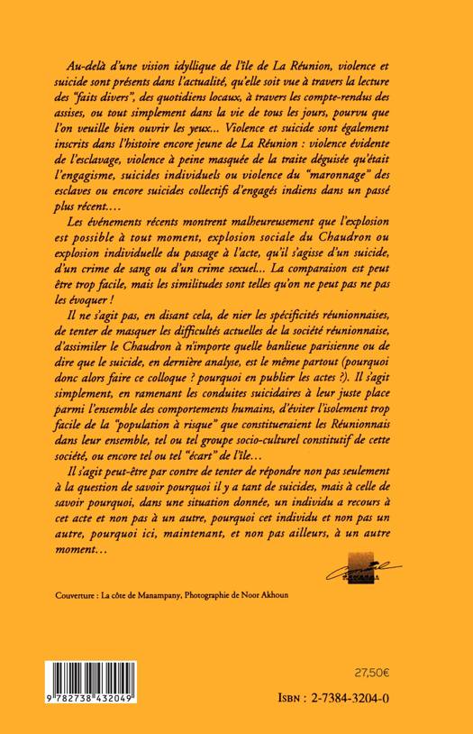 Au-delà d'une vision idyllique de l'île de La Réunion, violence et suicide sont présents dans l'actualité, qu'elle soit vue à travers la lecture des " faits divers ", des quotidiens locaux, à travers les compte-rendus des assises, ou tout simplement dans la vie de tous les jours, pourvu que l'on veuille bien ouvrir les yeux... Violence et suicide sont également inscrits dans l'histoire encore jeune de La Réunion : violence évidente de l'esclavage, violence à peine masquée de la traite déguisée qu'était l'éngagisme, suicides individuels ou violence du " maronnage " des esclaves ou encore suicides collectifs d'engagés indiens dans un passé plus récent.... Les événements récents montrent malheureusement que l'explosion est possible à tout moment, explosion sociale du Chaudron ou explosion individuelle du passage à l'acte, qu'il s'agisse d'un suicide, d'un crime de sang ou d'un crime sexuel... La comparaison est peut être trop facile, mais les similitudes sont telles qu'on ne peut pas ne pas les évoquer ! Il ne s'agit pas, en disant cela, de nier les spécificités réunionnaises, de tenter de masquer les difficultés actuelles de la société réunionnaise, d'assimiler le Chaudron à n'importe quelle banlieue parisienne ou de dire que le suicide, en dernière analyse, est le même partout (pourquoi donc alors faire ce colloque ? pourquoi en publier les actes ?). Il s'agit simpleme