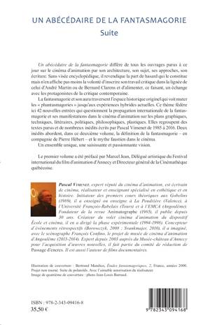Par son architecture, son sujet, ses approches et son écriture, Un abécédaire de la fantasmagorie diffère de tous les ouvrages parus à ce jour sur le cinéma d'animation. Ce second volume, qui, comme le premier, refuse toute visée encyclopédique, propose un échange avec les protagonistes de la critique contemporaine. L'auteur joue avec les formes et les sens que prennent la fantasmagorie et les "phantasmagories". Quarante-deux nouvelles entrées nous sont ici offertes.