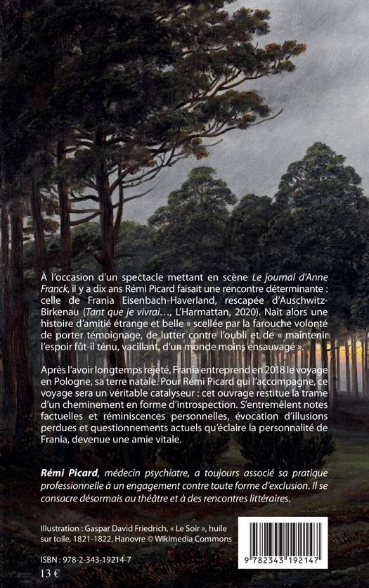 À l'occasion d'un spectacle mettant en scène Le journal d'Anne Franck, Rémi Picard faisait une rencontre déterminante : celle de Frania Eisenbach-Haverland, rescapée d'Auschwitz Birkenau. Après en avoir longtemps écarté l'idée, Frania entreprend en 2018 le voyage en Pologne, sa terre natale. Pour Rémi Picard qui l'accompagne, ce voyage sera un véritable catalyseur : cet ouvrage restitue la trame d'un cheminement en forme d'introspection. S'entremêlent notes factuelles et réminiscences personnelles, évocations d'illusions perdues et questionnements actuels qu'éclaire la personnalité de Frania, devenue une amie "vitale".