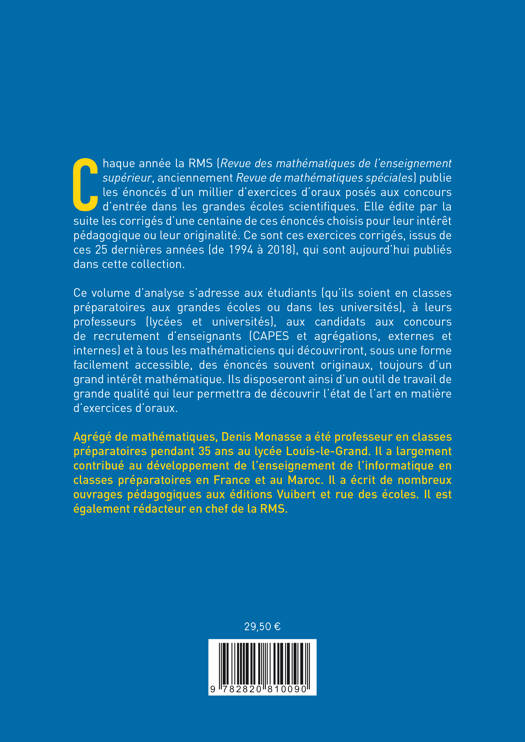 Chaque année la RMS (Revue des mathématiques de l'enseignement supérieur, anciennement Revue de mathématiques spéciales) publie les énoncés d'un millier d'exercices d'oraux posés aux concours d'entrée dans les grandes écoles scientifiques. Elle édite par la suite les corrigés d'une centaine de ces énoncés choisis pour leur intérêt pédagogique ou leur originalité. Ce sont ces exercices corrigés, issus de ces 25 dernières années (de 1994 à 2018), qui sont aujourd'hui publiés dans cette collection.