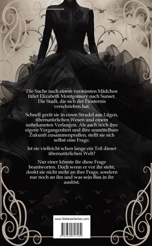 Die Suche nach einem vermissten Mädchen führt Elizabeth Montgomery nach Sunset.Die Stadt, die sich der Finsternis verschrieben hat.Schnell gerät sie in einen Strudel aus Lügen, übernatürlichen Wesen und einem unbekannten Verlangen.Als auch noch ihre eigene Vergangenheit und ihre unmittelbare Zukunft zusammenprallen, stellt sie sich selbst eine Frage.Ist sie vielleicht schon lange ein Teil dieser übernatürlichen Welt?Nur einer könnte ihr diese Frage beantworten.Doch wenn er vor ihr steht, denkt sie nicht mehr an ihre Frage, sondern nur noch an ihn und was sein Biss in ihr auslöst.