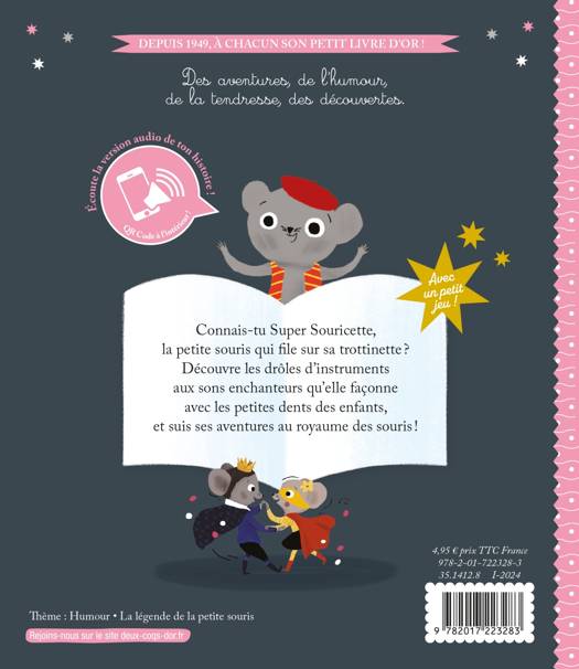 Connais-tu Super Souricette, la petite souris qui file sur sa trottinette ? Découvre les drôles d’instruments aux sons enchanteurs qu’elle façonne avec les petites dents des enfants, et suis ses aventures au royaume des souris !