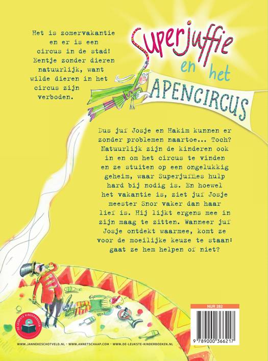Het is zomervakantie en er is een circus in de stad! Eentje zonder dieren natuurlijk, want wilde dieren in het circus zijn verboden. Dus juf Josje en Hakim kunnen er zonder problemen naartoe… Toch? Natuurlijk zijn de kinderen ook in en om het circus te vinden en zo raken ze midden in de zomer opeens weer in een nieuw avontuur verzeild. En ondanks dat het vakantie is, ziet juf Josje meester Snor vaker dan haar lief is. Hij lijkt ergens mee in zijn maag te zitten. Wanneer juf Josje erachter komt waarmee, komt ze voor de moeilijke keuze te staan: gaat ze hem helpen of niet?