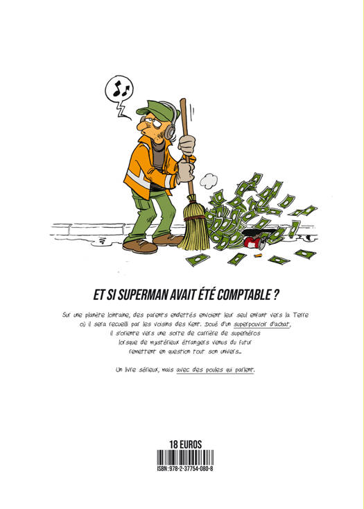Et si Superman avait été comptable ? Sur une planète lointaine, des parents empressés envoient leur seul enfant vers la Terre où il sera recueilli par les voisins des Kent. Doué d'un superpouvoir d'achat, il s'oriente vers une sorte de carrière de superhéros lorsque de mystérieux étrangers venant du futur remettent en question tout son univers... Un livre sérieux, mais avec des poules qui parlent.