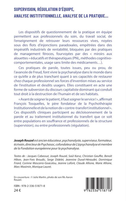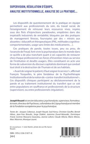Les dispositifs de questionnement de la pratique en équipe permettent aux professionnels du soin, du travail social, de l'enseignement de retrouver leurs ressources vives, noyées sous des flots d'injonctions paradoxales, empêtrées dans des impératifs industriels de rentabilité, bloquées par des pratiques de management féroces, fourvoyées par des miroirs aux alouettes éducatifs et thérapeutiques (PNL, méthodes cognitivo-comportementales, usage sans limite des médicaments...). Ces pratiques de parole, toutes issues, peu ou prou, de l'avancée de Freud, font vivre la psychanalyse dans le monde dans ce qu'elle a de plus tranchant quant à ses capacités de restaurer chez chaque professionnel ses forces d'invention mises au service de l'institution et desdits usagers. Elles constituent en acte une forme de subversion du discours capitaliste dominant qui conduit tout droit à la destruction de l'humain et de ses habitats. Avant de soigner le patient, il faut soigner le service !, affirmait François Tosquelles, le père fondateur de la Psychothérapie Institutionnelle et de la notion de contre-transfert institutionnel . Ces dispositifs cliniques participent au décloisonnement de la parole et au traitement institutionnel du transfert que ce soit entre populations en souffrance et professionnels de la structure (supervision), ou entre professionnels (régulation).