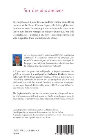 Li Qingzhao est à juste titre considérée comme la meilleure poétesse de la Chine. Comme Sapho, elle doit sa gloire à un nombre restreint de textes qui nous dévoilent le cours de sa vie en nous faisant partager sa présence au monde. Par-delà les siècles, ses "poèmes à chanter" nous font entendre la voix singulière d'une musicienne du silence.