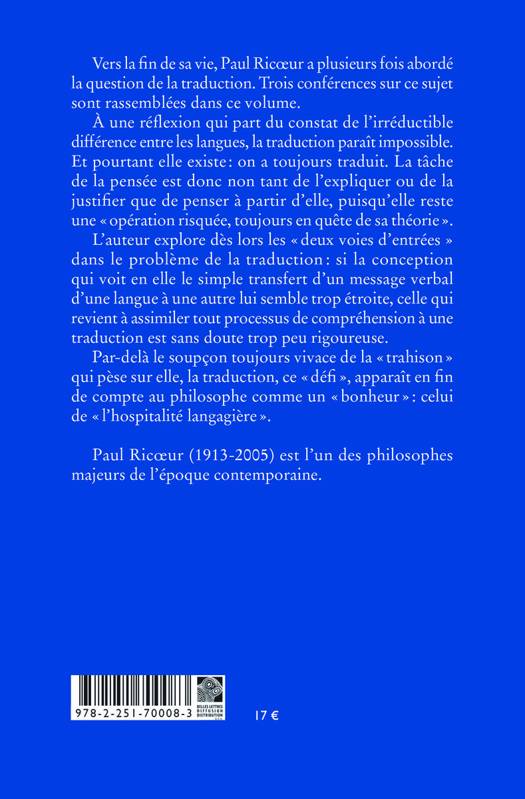 Vers la fin de sa vie, Paul Ricoeur a plusieurs fois aborde la question de la traduction. Trois conferences sur ce sujet sont rassemblees dans ce volume. A une reflexion qui part du constat de l'irreductible difference entre les langues, la traduction parait impossible. Et pourtant elle existe: on a toujours traduit. La tache de la pensee est donc non tant de l'expliquer ou de la justifier que de penser a partir d'elle, puisqu'elle reste une operation risquee, toujours en quete de sa theorie . L'auteur explore des lors les deux voies d'entrees dans le probleme de la traduction: si la conception qui voit en elle le simple transfert d'un message verbal d'une langue a une autre lui semble trop etroite, celle qui revient a assimiler tout processus de comprehension a une traduction est sans doute trop peu rigoureuse. Par-dela le soupcon toujours vivace de la trahison qui pese sur elle, la traduction, ce defi , apparait en fin de compte au philosophe comme un bonheur celui de l'hospitalite langagiere .