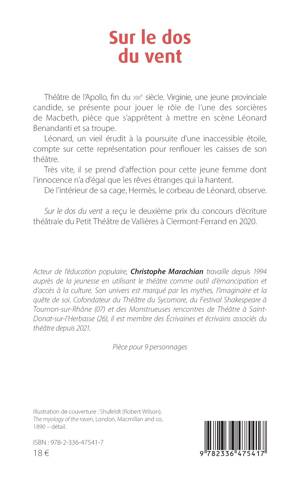 Théâtre de l'Apollo, fin du XIXe siècle. Virginie, une jeune provinciale candide, se présente pour jouer le rôle de l'une des sorcières de Macbeth, pièce que s'apprêtent à mettre en scène Léonard Benandanti et sa troupe. Léonard, un vieil érudit à la poursuite d'une inaccessible étoile, compte sur cette représentation pour renflouer les caisses de son théâtre. Très vite, il se prend d'affection pour cette jeune femme dont l'innocence n'a d'égal que les rêves étranges qui la hantent. De l'intérieur de sa cage, Hermès, le corbeau de Léonard, observe. Sur le dos du vent a reçu le deuxième prix du concours d'écriture théâtrale du Petit Théâtre de Vallières à Clermont-Ferrand en 2020.