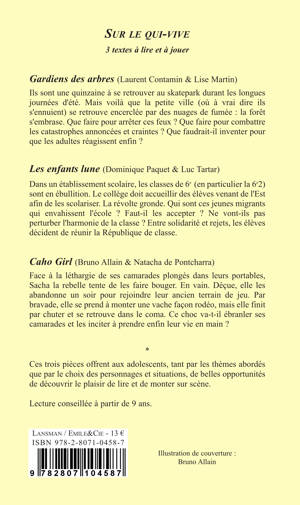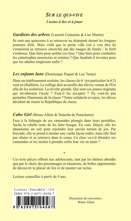 Gardiens des arbres (Laurent Contamin & Lise Martin) Ils sont une quinzaine à se retrouver au skatepark durant les longues journées d'été. Mais voilà que la petite ville (où à vrai dire ils s'ennuient) se retrouve encerclée par des nuages de fumée : la forêt s'embrase. Que faire pour arrêter ces feux ? Que faire pour combattre les catastrophes annoncées et craintes ? Que faudrait-il inventer pour que les adultes réagissent enfin ?
