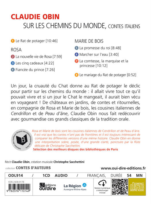 Un jour, la cruauté du Chat donne au Rat de potager le déclic pour partir sur les chemins du monde : il allait vivre tout ce qu'il pouvait vivre et si un jour le Chat le mangeait, il aurait bien vécu en voyageant ! De châteaux en jardins, de contes et ritournelles, en compagnie de Rosa et Marie de bois, les cousines italiennes de Cendrillon et de Peau d'âne, Claudie Obin nous fait redécouvrir avec gourmandise ces grands classiques de la tradition orale.