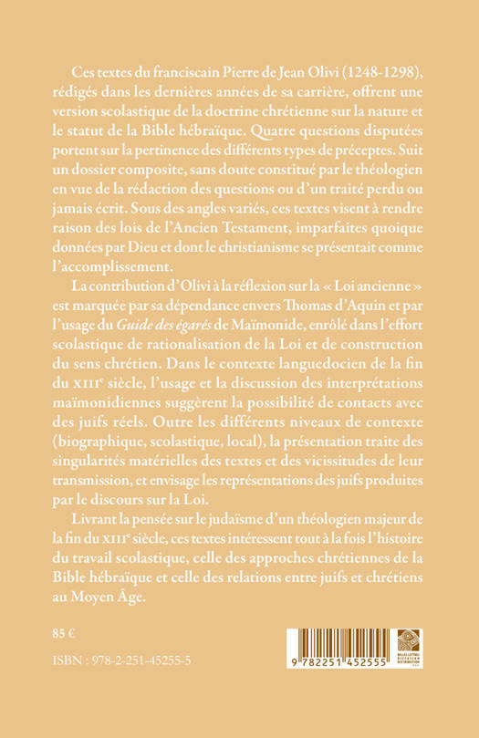 Ces textes du franciscain Pierre de Jean Olivi (1248-1298), rediges dans les dernieres annees de sa carriere, offrent une version scolastique de la doctrine chretienne sur la nature et le statut de la Bible hebraique. Quatre questions disputees portent sur la pertinence des differents types de preceptes. Suit un dossier composite, sans doute constitue par le theologien en vue de la redaction des questions ou d'un traite perdu ou jamais ecrit. Sous des angles varies, ces textes visent a rendre raison des lois de l'Ancien Testament, imparfaites quoique donnees par Dieu et dont le christianisme se presentait comme l'accomplissement. La contribution d'Olivi a la reflexion sur la Loi ancienne est marquee par sa dependance envers Thomas d'Aquin et par l'usage du Guide des egares de Maimonide, enrole dans l'effort scolastique de rationalisation de la Loi et de construction du sens chretien. Dans le contexte languedocien de la fin du XIIIe siecle, l'usage et la discussion des interpretations maimonidiennes suggerent la possibilite de contacts avec des juifs reels. Outre les differents niveaux de contexte (biographique, scolastique, local), la presentation traite des singularites materielles des textes et des vicissitudes de leur transmission, et envisage les representations des juifs produites par le discours sur la Loi. Livrant la pensee sur le judaisme d'un theologien majeur de la fin du XIIIe siecle, ces textes interessent tout a la fois l'histoire du travail scolastique, celle des approches chretiennes de la Bible hebraique et celle des relations entre juifs et chretiens au Moyen Age.