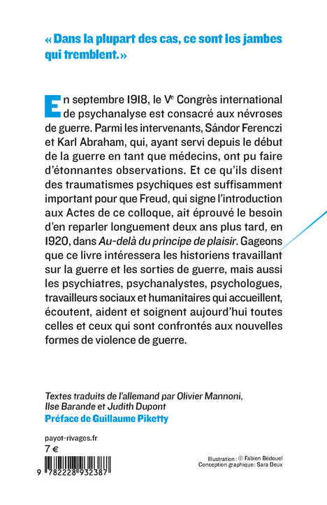 En septembre 1918, le Ve Congrès international de psychanalyse est consacré aux névroses de guerre. Parmi les intervenants, Sándor Ferenczi et Karl Abraham, qui, ayant servi depuis le début de la guerre en tant que médecins, ont pu faire d'étonnantes observations. Et ce qu'ils disent des traumatismes psychiques est suffisamment important pour que Freud, qui signe l'introduction aux Actes de ce colloque, ait éprouvé le besoin d'en reparler longuement deux ans plus tard, en 1920, dans "Au-delà du principe de plaisir". Gageons que ce livre intéressera les historiens travaillant sur la guerre et les sorties de guerre, mais aussi les psychiatres, psychanalystes, psychologues, travailleurs sociaux et humanitaires qui accueillent, écoutent, aident et soignent aujourd'hui toutes celles et ceux qui sont confrontés aux nouvelles formes de violence de guerre.