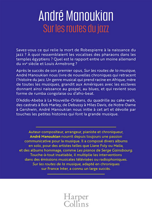 Après le succès de son premier opus, Sur les routes de la musique, André Manoukian revient avec de nouvelles chroniques qui retracent l’histoire du jazz. Un genre musical qui prend racine en Afrique, grandit aux Amériques avec les esclaves donnant ainsi naissance au gospel, au blues, et qui revient sous forme de rumba congolaise ou d’afro-beat.