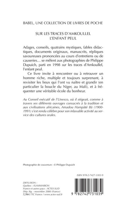 Adages, conseils, quatrains mystiques, fables didactiques, documents originaux, manuscrits, répliques savoureuses prononcées au cours d'entretiens ou de causeries... se mêlent aux photographies de Philippe Dupuich, parti en 1998, sur les traces d'Amkoullel, l'enfant peul.