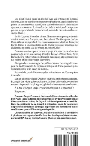 Qui peut réunir dans un même livre un critique de cinéma émérite, une ex-star du cinéma pornographique, un cascadeur de génie, un ancien coach sportif, une comédienne aussi talentueuse que renommée et un écrivain fou de cinéma asiatique ? La réponse pourra surprendre de prime abord, avant de devenir évidente : Jackie Chan ! En 2017, après 15 années où ses films n’avaient presque jamais atteint les écrans français, sort l’excellent The Foreigner. Jackie Chan, 63 ans, se rappelle à nos bons souvenirs et, dès lors, François Barge-Prieur a une idée folle : celle d’aller retrouver son idole de jeunesse ; de partir Sur les traces de Jackie Chan. Commence alors pour lui un voyage à la rencontre d’autres passionnés (avec, au casting, Charles Tesson, Céline Tran, Cyril Raffaelli, Éric Faber, Cécile de France), mais aussi à la rencontre de lui-même et de ses propres souvenirs. Plongée dans la nostalgie des vidéo-clubs et des magnétoscopes, de la découverte du cinéma asiatique et d’une passion qui a commencé il y a un quart de siècle… Journal de bord d’une enquête minutieuse et d’une quête insensée… Sur les traces de Jackie Chan est tout cela et même plus encore. Et, au gré des récits qui se croisent et du livre qui se crée, se dessine en creux le portrait du plus grand génie du cinéma comique d’action. À la fin, François Barge-Prieur rencontrera-t-il son idole ? Suspense…