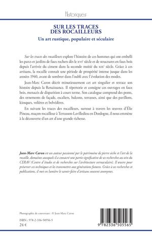 Sur les traces des rocailleurs explore l'histoire de ces hommes qui ont embelli les parcs et jardins de faux rochers dès le XVIe siècle et de structures en faux bois depuis l'arrivée du ciment dans la seconde moitié du XIXe siècle. Grâce à ces artisans, la rocaille connaît une période de prospérité intense jusque dans les années 1940, avant de sombrer dans l'oubli avec l'évolution des modes. Jean-Marc Caron décrit minutieusement cet art singulier et retrace son histoire depuis la Renaissance. Il répertorie et consigne ces ouvrages en faux bois, menacés de disparition à court terme. Son catalogue comprend des ponts, des ornements de façade, escaliers, balcons, terrasses, ainsi que des pavillons, kiosques, volières et belvédères. En suivant les traces des rocailleurs, surtout à travers les oeuvres d'Élie Pineau, maçon-rocailleur à Terrasson-Lavilledieu en Dordogne, il nous emmène à la découverte d'un art d'une grande richesse.