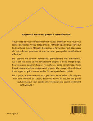 Apprenez à ajuster vos patrons à votre silhouette. Vous venez de vous confectionner un nouveau chemisier, mais vous vous sentez à l’étroit au niveau de la poitrine ? Votre robe paraît plus courte sur le devant qu’à l’arrière ? Des plis disgracieux se forment en haut des cuisses de votre dernier pantalon, et vous ne savez pas quelles modifications effectuer ? Les patrons de couture nécessitent généralement des ajustements, car il est rare qu’ils soient parfaitement adaptés à notre morphologie. Pour vous accompagner dans ces retouches, ce guide complet répertorie les principaux problèmes qui peuvent se poser à l’essayage et les solutions à leur apporter grâce à un ensemble de pas-à-pas clairs et précis. De la prise de mensurations et la gradation entre tailles à la préparation et la retouche de la toile, découvrez toutes les astuces des grands couturiers, pour vous coudre des vêtements qui soient réellement SUR-MESURE !