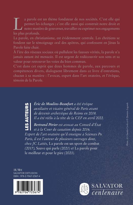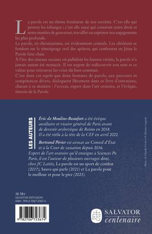 La parole est un thème fondateur de nos sociétés et de nos cultures. C'est elle qui permet les échanges, qui construit notre droit, notre manière de gouverner, de travailler ou d'exprimer nos engagements les plus profonds. La parole en christianisme est évidemment centrale. Les chrétiens se fondent sur la parole de témoins, les apôtres, qui confessent en Jésus-Christ la Parole faite chair. À l'ère des réseaux sociaux où pullulent les fausses vérités, la parole n'a jamais autant été menacée. Il est urgent de retrouver son sens et sa valeur incommensurables pour retrouver les voies du vivre-ensemble et du bien commun. C'est dans cet esprit que deux hommes de parole, aux parcours et aux compétences diverses, conversent librement dans ce livre d'entretiens inédit, chacun à sa manière : l'avocat, expert dans l'art oratoire, et l'évêque, témoin de la Parole. AUTEURS Éric de Moulins-Beaufort a été évêque auxiliaire et vicaire général de Paris avant de devenir archevêque de Reims en 2018. Il a été réélu à la tête de la CEF en avril 2022. Bertrand Périer est avocat au Conseil d'État et à la Cour de cassation depuis 2016. Expert de l'art oratoire qu'il enseigne à Sciences Po Paris, il est l'auteur de plusieurs ouvrages dont, chez JC Lattès, La parole est un sport de combat (2017), Sauve qui parle (2021) et La parole pour le meilleur et pour le pire (2023).