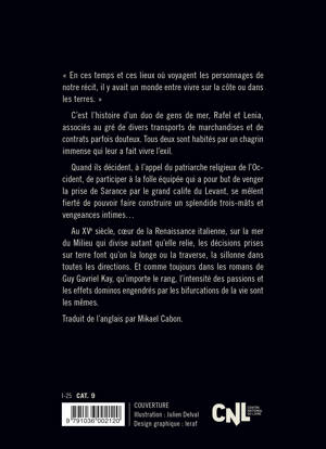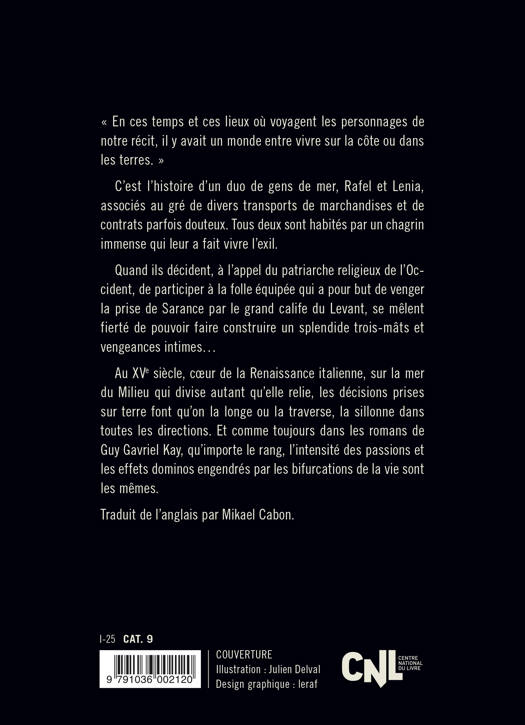 Au XVe siècle, cœur de la Renaissance italienne, sur la mer du Milieu qui divise autant qu'elle relie, les décisions prises sur terre font qu'on la longe ou la traverse, la sillonne dans toutes les directions. Et comme toujours dans les romans de Guy Gavriel Kay, qu'importe le rang, l'intensité des passions et les effets dominos engendrés par les bifurcations de la vie sont les mêmes.