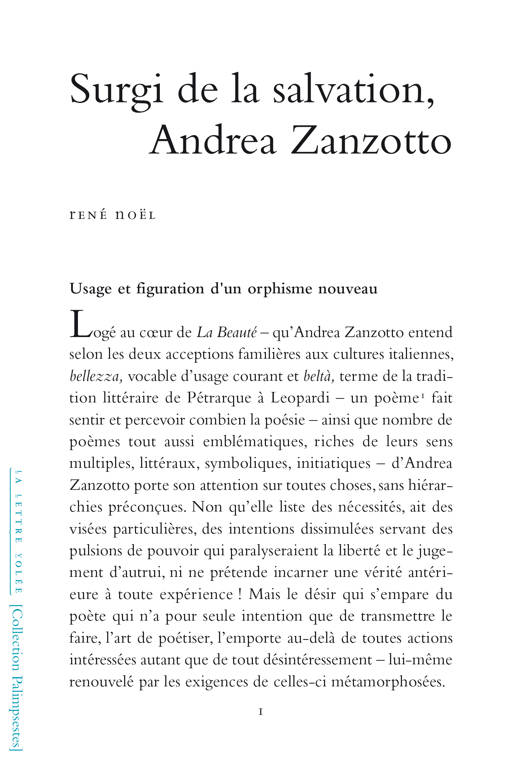 Fidèle à toutes les inscriptions de la poésie de son siècle, non seulement d’Italie mais d’Europe occidentale jusqu’à l’Inde, l’art poétique d’Andrea Zanzotto (largement traduit en français par Philippe Di Meo) ne se réduit pas à un échantillonnage, à une combinaison de genres et de styles antagonistes mais compose et joue le va-tout de la poésie par rapport à ses périodes fastes et même décadentes. Zanzotto a l’oreille musicienne initiant les formes nouvelles du poème, ouïe qui prend langue avec l’œil et la parole mobile des vivants rapportant les mémoires des morts, portant leurs langues, leurs mots et leurs paroles vives au cœur du présent.René Noël (né en 1959 à Givet dans les Ardennes), poète et critique vivant à Strasbourg, est l’auteur de deux recueils de poèmes : Bancs de Rayons (Toulon, La Termitière, 2010) ; D’étoiles (Toulon, La Nerthe, 2023) et d’un essai consacré à Vélimir Khlebnikov : Créations critiques (des mimésis). Khlebnikov (Toulon, La Nerthe, 2020). Ses poèmes et études critiques sur Alejandra Pizarnik, Paul Celan, Gerard Manley Hopkins et d’autres poètes contemporains sont publiés notamment dans les revues La Polygraphe, L’Étrangère, Cahier critique de poésie et sur le site Sitaudis.fr.