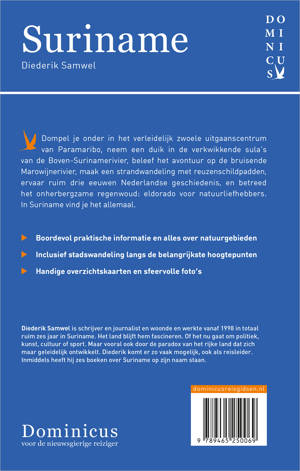Ontdek Suriname op vakantie met deze Dominicus-reisgids en verken Paramaribo, en de overweldigende natuur, machtige rivieren en prachtige dorpen die dit land bevat. Dwaal met auteur Diederik Samwel door de bruisende stad Paramaribo, het sprookjesachtige binnenland van Suriname en ontdek de roerige geschiedenis die het land in korte tijd heeft doorgemaakt. Suriname wordt gekenmerkt door haar vele kleurrijke volken, exotische regenwouden en zeldzame zoogdieren, vogels en vissen. Een land dat iedereen zou moeten bezoeken. Deze reisgids staat boordevol praktische informatie, historische achtergronden, handige overzichtskaarten, sfeervolle foto's en uitgebreide culturele achtergrondinformatie, is altijd up-to-date en geschreven door een Nederlandstalige expert. Diederik Samwel is schrijver en journalist en woonde en werkte vanaf 1998 in totaal ruim zes jaar in Suriname. Het land blijft hem fascineren. Of het nu gaat om politiek, kunst, cultuur of sport. Maar vooral ook door de paradox van het rijke land dat zich maar geleidelijk ontwikkelt. Diederik komt er zo vaak mogelijk, ook als reisleider. Inmiddels heeft hij zes boeken over Suriname op zijn naam staan.