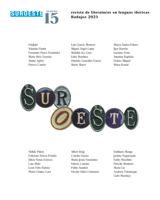 En su decimoquinto número, con el reconocimiento a su singularidad, Suroeste deja de presentarse como Revista de literaturas ibéricas para pasar a ser Revista de literaturas en lenguas ibéricas, con lo cual sus páginas se abren también a las colaboraciones de autores de cualquier latitud que se expresen en alguna de las lenguas peninsulares. Este número recoge textos de poesía, narrativa y ensayo. En esencia, una apuesta por el presente y futuro de la literatura desde una revista que quiere estar también en la vanguardia de la escritura. Adermás, se incluyen dos encartes de las artistas Lourdes Murillo y Rui Macedo.