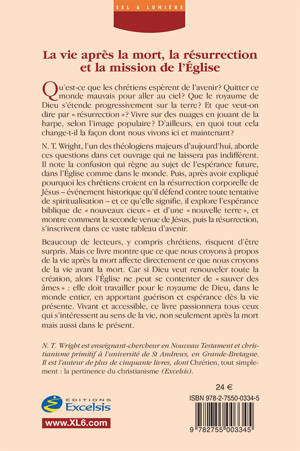 N. T. Wright, l’un des théologiens majeurs d’aujourd’hui, aborde ces questions dans cet ouvrage qui ne laissera pas indifférent. Il note la confusion qui règne au sujet de l’espérance future, dans l’Église comme dans le monde. Puis, après avoir expliqué pourquoi les chrétiens croient en la résurrection corporelle de Jésus – événement historique qu’il défend contre toute tentative de spiritualisation – et ce qu’elle signifie, il explore l’espérance biblique de « nouveaux cieux » et d’une « nouvelle terre », et montre comment la seconde venue de Jésus, puis la résurrection, s’inscrivent dans ce vaste tableau d’avenir. Ce livre montre que ce que nous croyons à propos de la vie après la mort affecte directement ce que nous croyons de la vie avant la mort. Car si Dieu veut renouveler toute la création, alors l’Église ne peut se contenter de « sauver des âmes » : elle doit travailler pour le royaume de Dieu, dans le monde entier, en apportant guérison et espérance dès la vie présente.