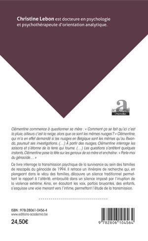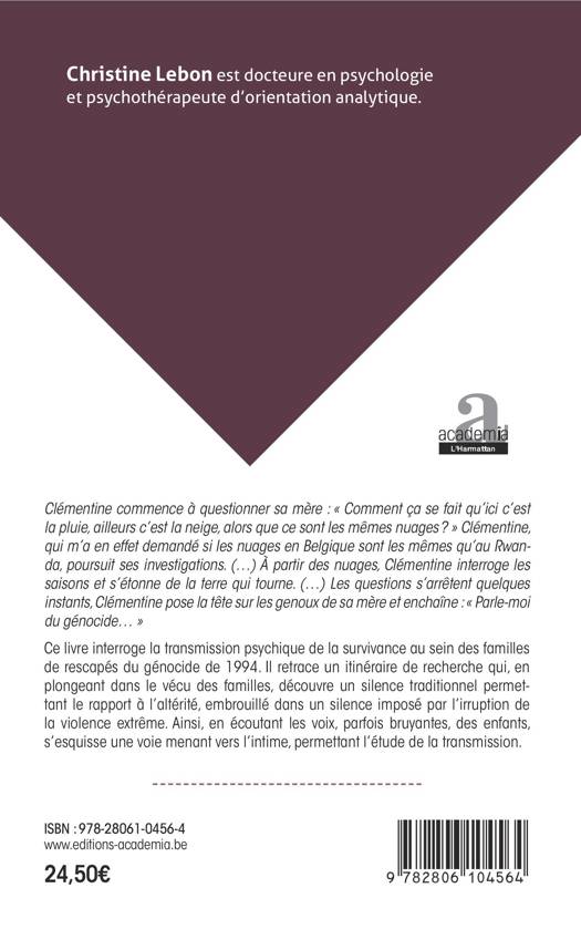 Ce livre interroge la transmission psychique de la survivance au sein des familles de rescapés du génocide de 1994. Il retrace un itinéraire de recherche qui, en plongeant dans le vécu des familles, découvre un silence traditionnel permettant le rapport à l'altérité, embrouillé dans un silence imposé par l'irruption de la violence extrême. Ainsi, en écoutant les voix, parfois bruyantes, des enfants, s'esquisse une voie menant vers l'intime, permettant l'étude de la transmission.