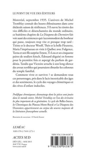 Montréal, septembre 1935. L'univers de Michel Tremblay connaît des heures éblouissantes dans cette théâtrale saison de résiliences. S'il ouvre les tiroirs des vies difficiles et désenchantées du monde ordinaire, ce huitième chapitre de «La diaspora des Desrosiers» fait voir aussi des existences qui s'accommodent du bonheur qui passe, toujours trop vite et presque trop tard : Tititte et le docteur Woolf, Théo et la belle Fleurette, Maria l'impétueuse en virée à Québec avec Fulgence, Teena et son fils surprise, Ernest, Ti-Lou et ses cinquante paires de souliers kitsch, Édouard déguisé en femme pour la première fois et aspergé de gardénia. Tandis que Victoire s'arrache des aveux terribles qui pourraient ébranler les colonnes du temple familial.