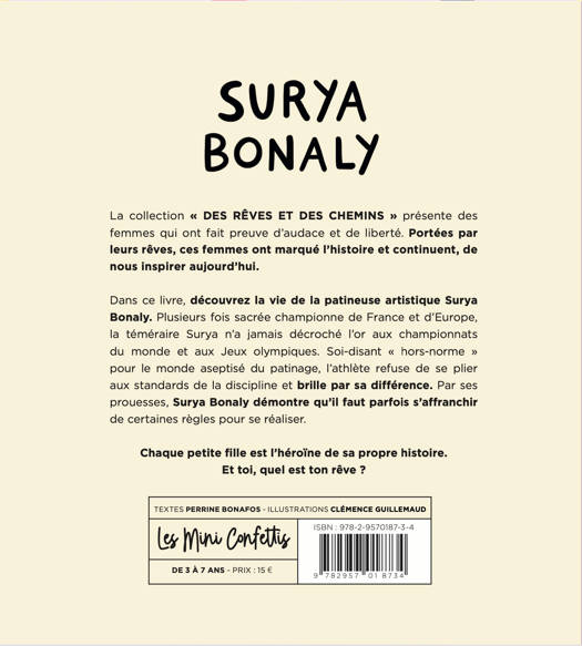 Découvrez la vie de Surya Bonaly l’une des plus emblématiques femmes du monde du sport. Surya Bonaly est une patineuse artistique dont le nom marquera à jamais l’histoire du sport. À 12 ans, elle rejoint l’équipe de France de patinage artistique. Surya est une grande performeuse et son style unique ne correspond pas aux standards de son époque qui valorisent la figure de la gracieuse et blanche poupée de glace. Déterminée et travailleuse, Surya Bonaly prouvera au monde que seul compte son talent. Elle inventera son propre saut périlleux lors des Jeux Olympiques de Nagano en 1998 : le Bonaly. Durant toute sa carrière, Surya Bonaly évoluera avec une philosophie en tête : à quoi bon suivre la piste des autres quand on peut prendre sa propre voie ? Ce livre pour enfant est une belle occasion de découvrir et d'aborder les thèmes suivants : AUDACE : oser bousculer les codes et assumer ses choix INJUSTICE : apprendre à composer avec ce sentiment DÉTERMINATION : ne pas renoncer en dépit des échecs, des défaites SPORT : une école de vie qui fait la part belle au plaisir, au jeu mais aussi au sens de l'effort et à la compétition