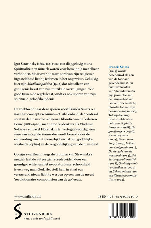 Igor Stravinsky (1882-1971) was een diepgelovig mens. Spiritualiteit en muziek waren voor hem innig met elkaar verbonden. Maar over de ware aard van zijn religieuze ingesteldheid liet hij iedereen in het ongewisse. Gelukkig is er zijn 'Muzikale Poëtica'(1942) dat niet alleen een getuigenis bevat van zijn muzikale overtuigingen. Wie goed tussen de regels leest, vindt er ook sporen van zijn spirituele geloofsbelijdenis. Deze blijken steeds verbonden met het neoplatonisme. De zoektocht naar deze sporen voert Francis Smets o.a. naar de Russische filosofen van de Vseedinstvo of ‘Al-Eenheid’ die aan het einde van de 19e en het begin van de 20e eeuw een ware renaissance van het neoplatonisme veroorzaakten. Op zijn zwerftocht langs deze bronnen laat de auteur zich steeds leiden door een grondgedachte van het neoplatonisme: schoonheid is een weg naar God. Op deze wijze werpt hij tevens een heel ander licht op een van de meest ‘revolutionaire’ componisten van de 20e eeuw.
