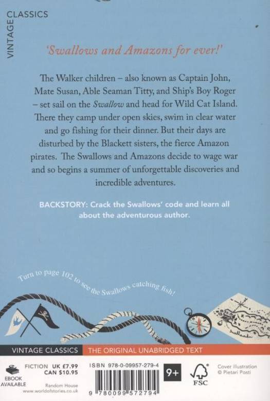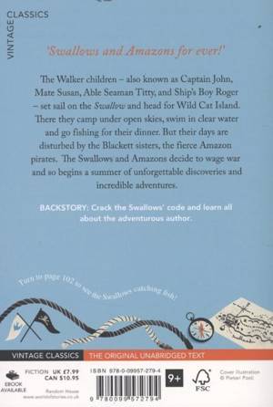 'Swallows and Amazons for ever!'Rediscover this classic tale of adventure. The Walker children - also known as Captain John, Mate Susan, Able-Seaman Titty, and Ship's Boy Roger - set sail on the Swallow and head for Wild Cat Island.