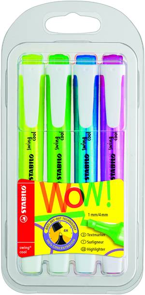 STABILO swing cool, 4 surligneurs - couleurs fluorescentes. STABILO swing cool, le surligneur fin au format de poche. Protection anti-séchage pendant 4 heures, largeurs de trait de 1 et 4 mm. Avec son design plat et son clip pratique, le STABILO swing cool est le compagnon idéal de vos déplacements.